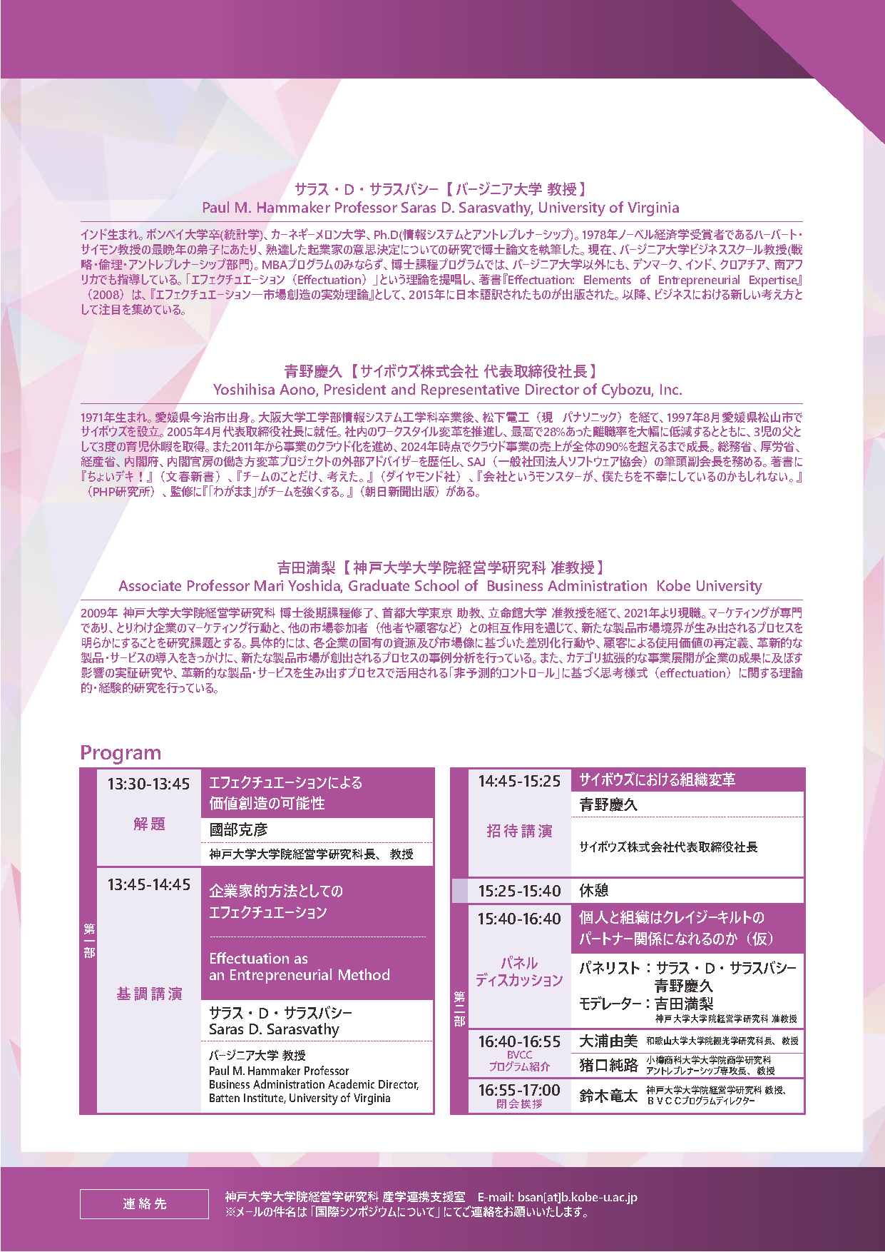 このたび米国からエフェクチュエーションの提唱者であり、世界的に著名な研究者であるSaras D. Sarasvathy 教授(バージニア大学)を招聘し、国際シンポジウムを開催いたします。Sarasvathy 教授の基調講演に続き、多様な個性を持つ社員一人ひとりの思考と行動をチームの力に変えるための独自のマネジメントを工夫されている、サイボウズ株式会社の青野慶久社長にもご講演いただきます。